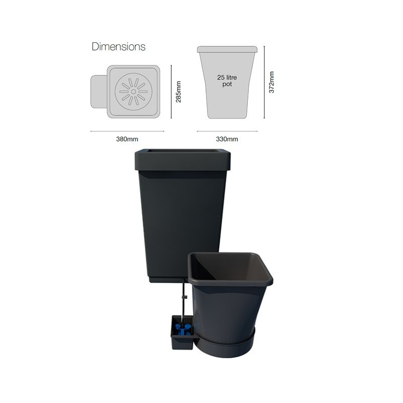 Extrémně úsporný samozavlažovací systém pro větší rostliny. Autopot 1Pot XL Module s 25 litrovým květináčem a 47 litrovou nádrží.